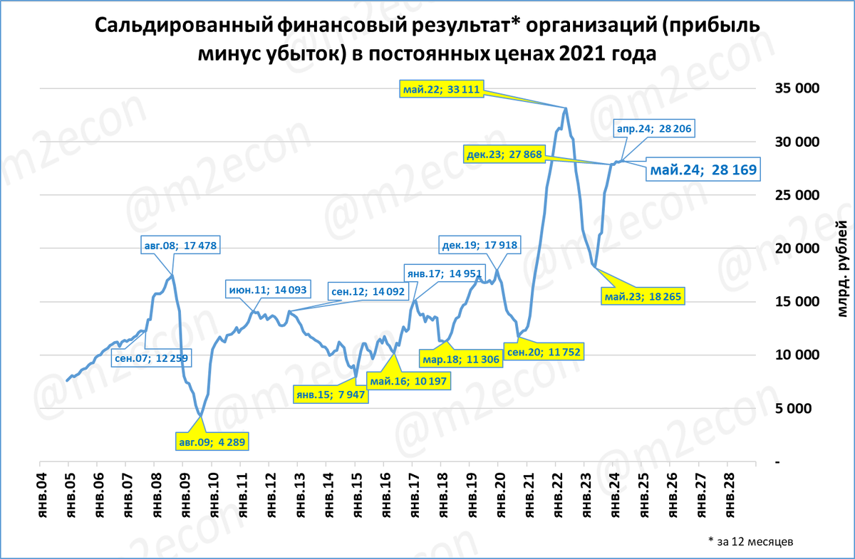Прибыль предприятий в мае приросла на 3 трлн рублей. Месяц входит в десятку лучших за всю историю. Прибыль за последние 12 месяцев (скользящий год) в реальном выражении стабилизировалась на уровне 28,2 трлн. в рублях 2021 года.