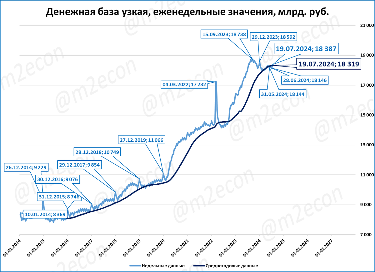 По данным ЦБ, узкая денежная база на 19 июля составила 18,4 трлн рублей.