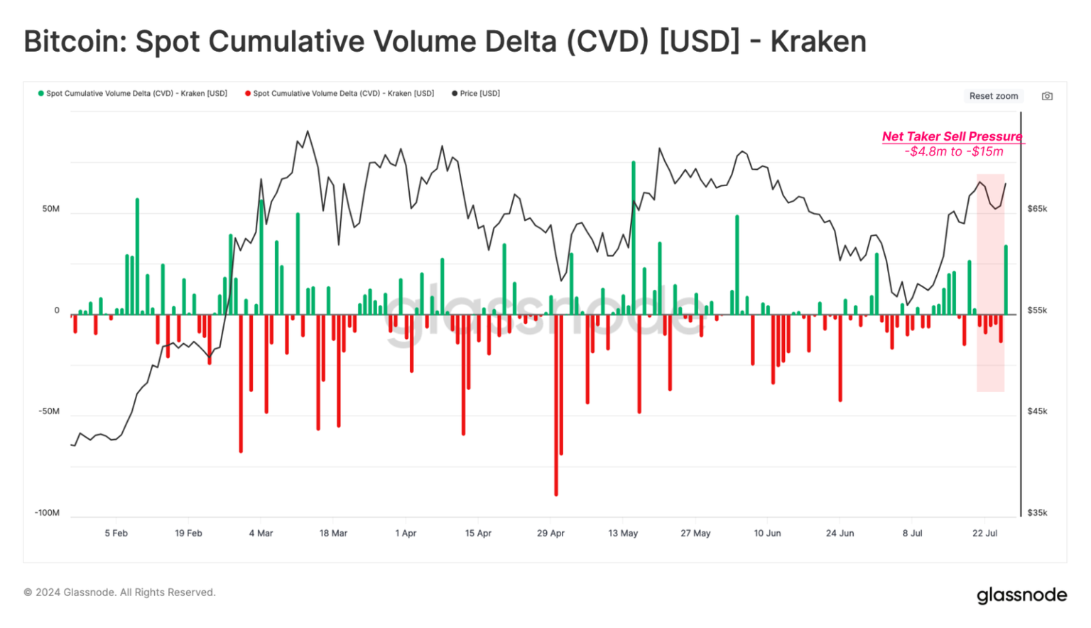 Для конкретизации своей гипотезы эксперты использовали метрику спотовой кумулятивной дельты объема (CVD) применительно к двум получателям средств — Kraken и Bitstamp. В первом случае индикатор остался в пределах типичных ежедневных диапазонов.