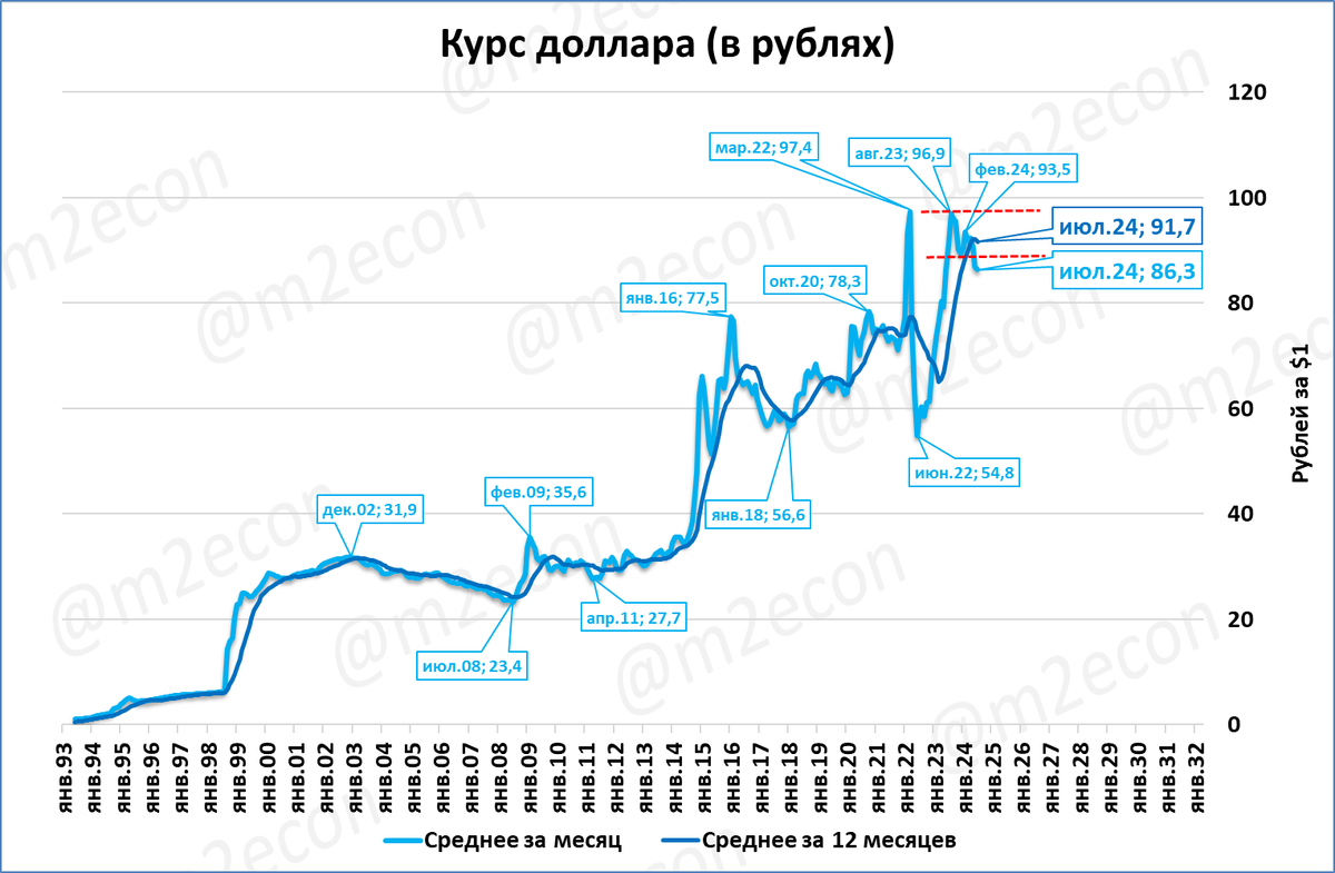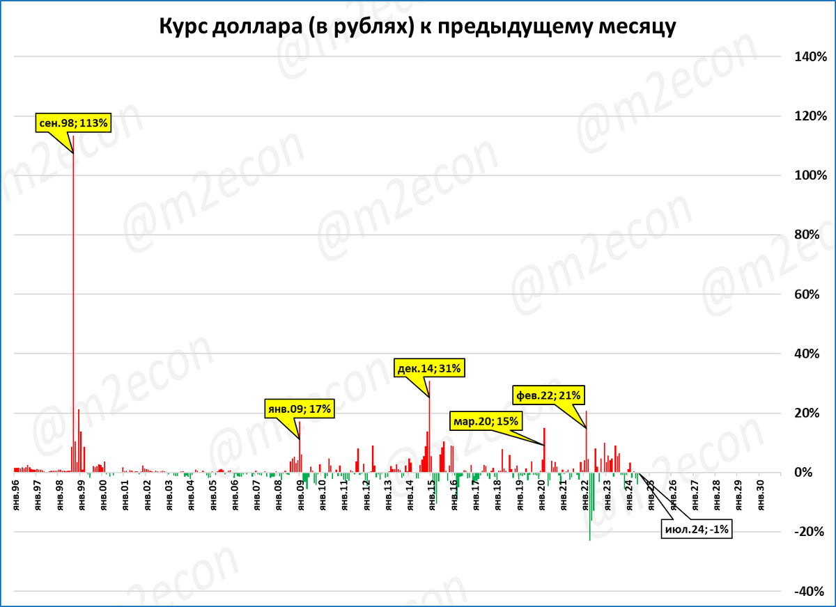 Резкие скачки курса (>15% к предыдущему месяцу) показаны жёлтыми выносками.