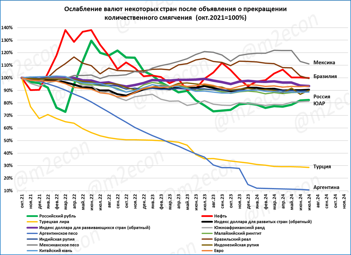 В целом валюты оказались более стабильны по отношению к доллару, чем после начала ужесточения 2013-14 годов. Одна из причин – рекордное со времён Второй мировой войны денежное смягчение в США, проведённое во время пандемии (2020-21 годы).