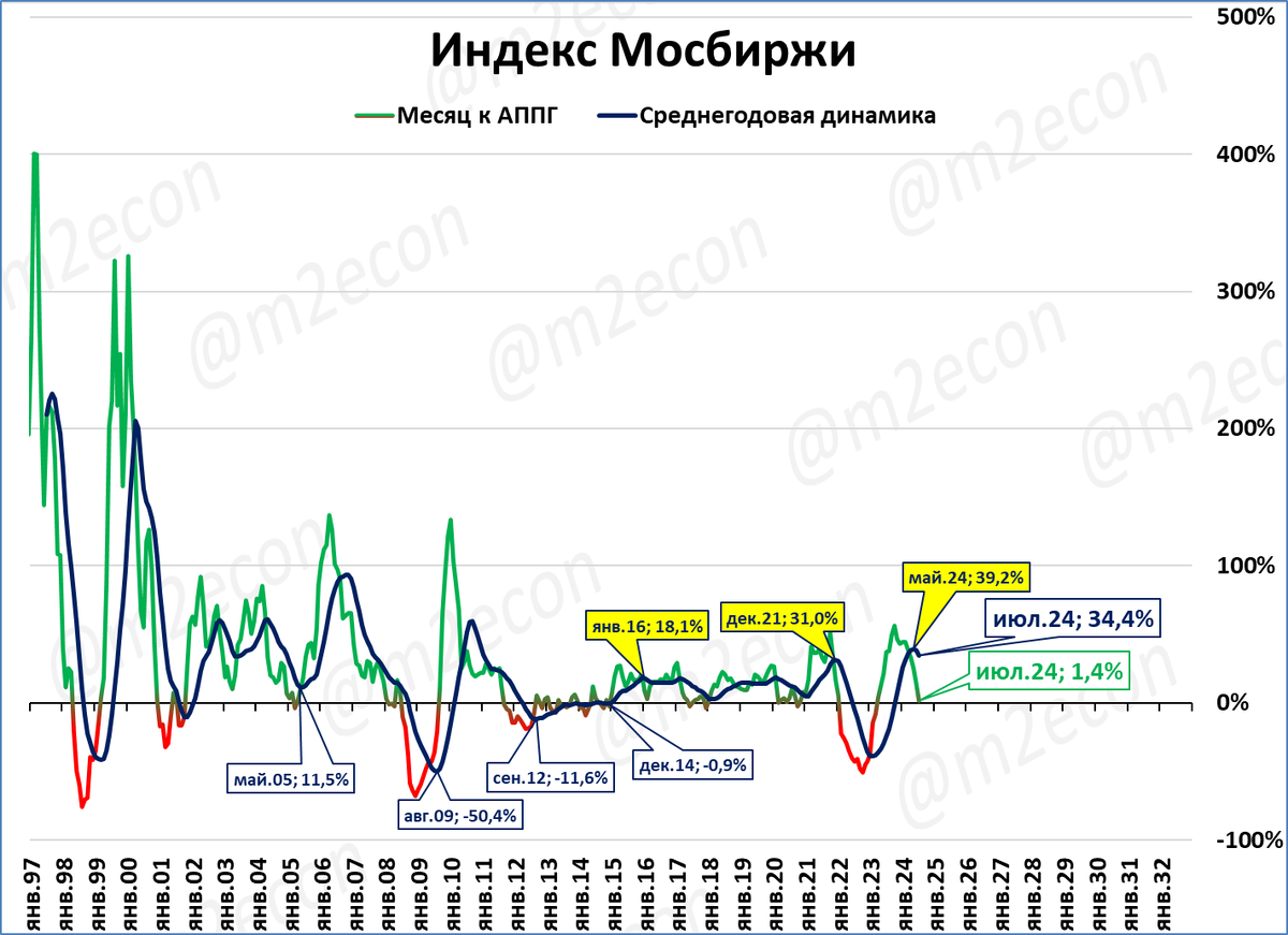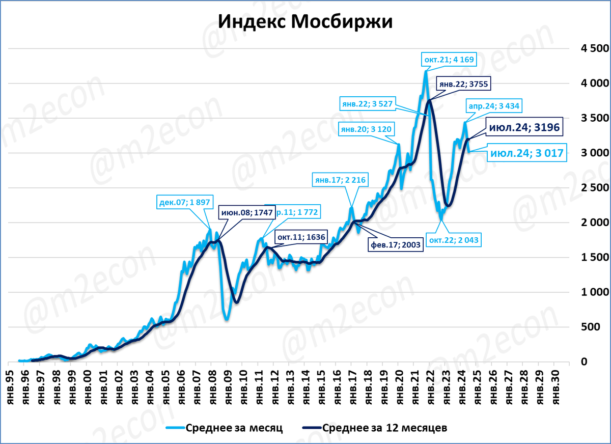 Индекс Мосбиржи в июле составил 3 017 пунктов, (+1% годовых). Индекс растёт с апреля прошлого года (16 месяцев).