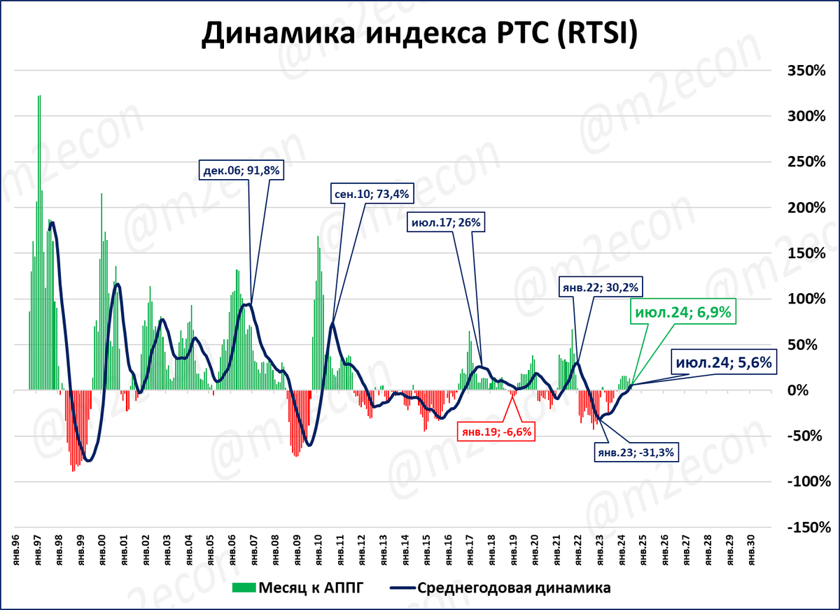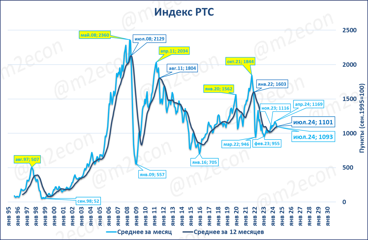 Индекс РТС в июле составил 1 093 пункта, (+7% годовых). Это восьмой месяц роста подряд.