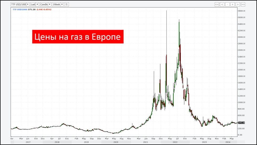 Цены на газ в Европе нормализовались после аномальных скачков 2021-2022 годов. Но текущая цена примерно в 1,5 раза выше, чем до 2021 года. Схожая динамика и на рынках Азии.