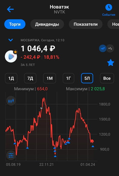 С октября 2023 года акции Новатэка находятся в нисходящем тренде. Падение с локальных максимумов около 40%.
