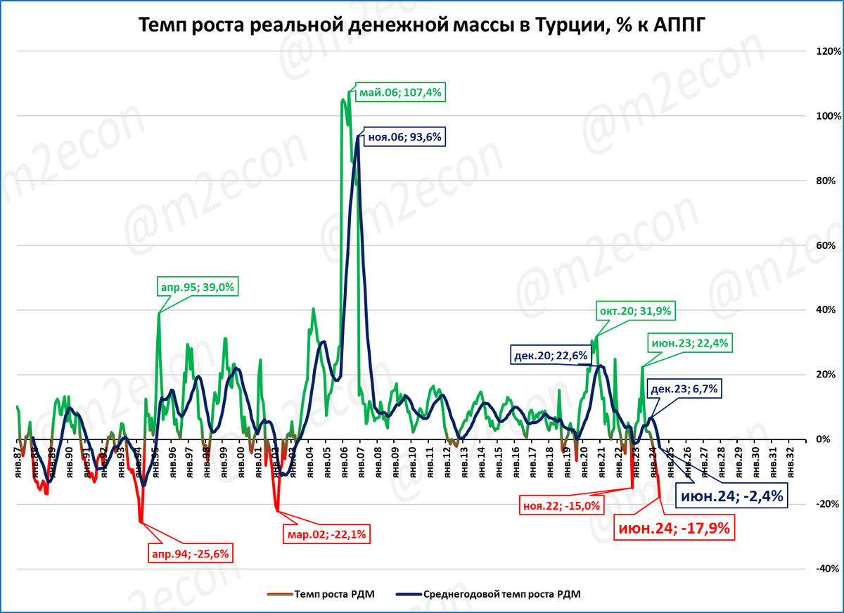 Турция: рост денежного агрегата М2 в номинальном выражении в июне составил 40,9%. В реальном выражении денежная масса упала на 17,9% по сравнению с прошлым годом. РДМ падает уже 6-й месяц.