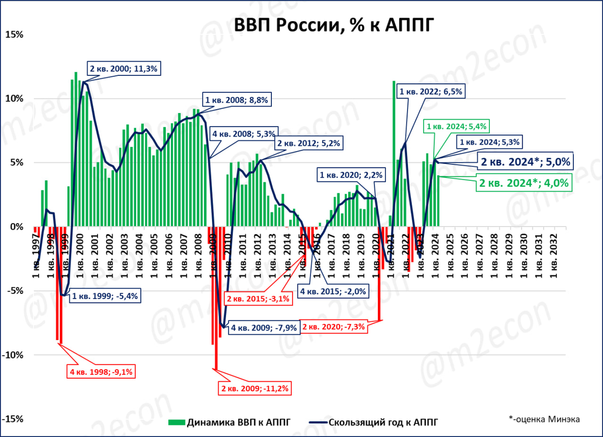По оценке того же Минэка, рост ВВП во 2 квартале составил 4% (ко 2 кварталу 2023 года).