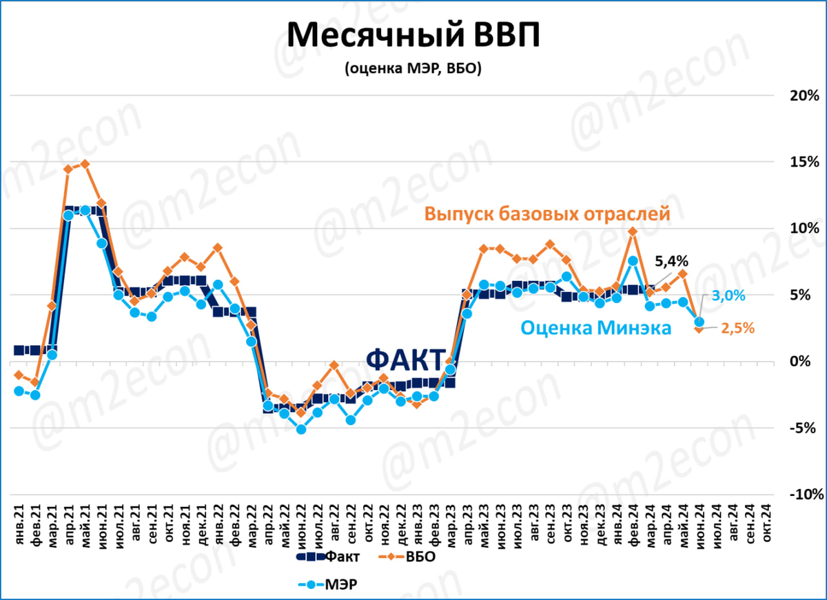 По оценке минэка рост ВВП в июне составил 3%. В кои веки оценка минэка оказалась выше, чем выпуск базовых отраслей (2,5%).