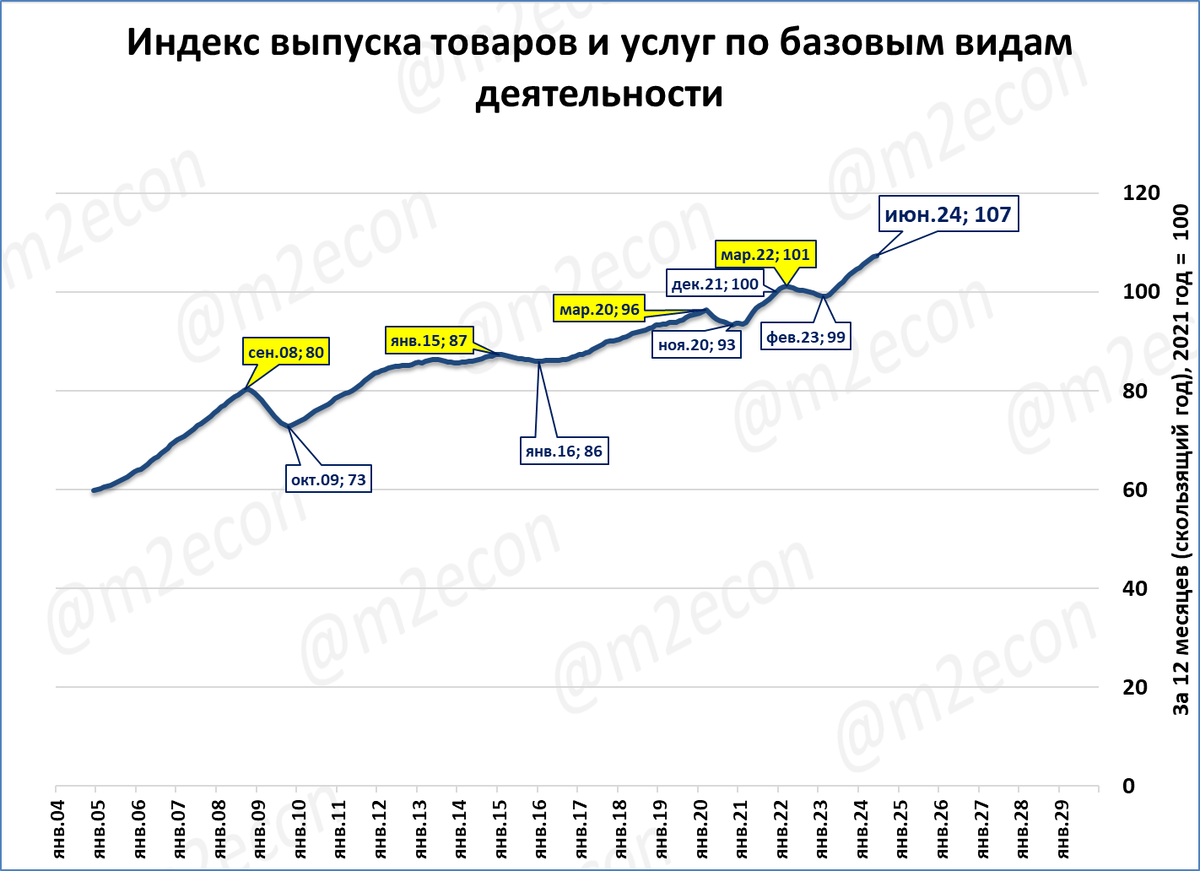 Выпуск базовых отраслей (ВБО; это около 60% ВВП; кроме промпроизводства включает в себя сельское хозяйство, строительство, транспорт и торговлю) в июне вырос 2,5% к июню прошлого года. Учитывая, что рабочих дней в июне 2024 было на 10% меньше, чем в июне прошлого года, это неплохой результат.