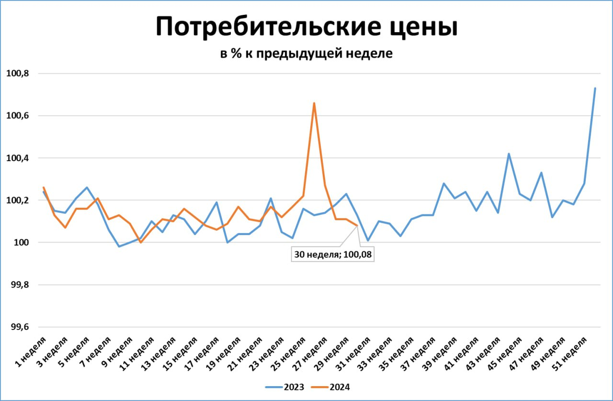 Так, за 30-ю неделю цены выросли на 0,08%.