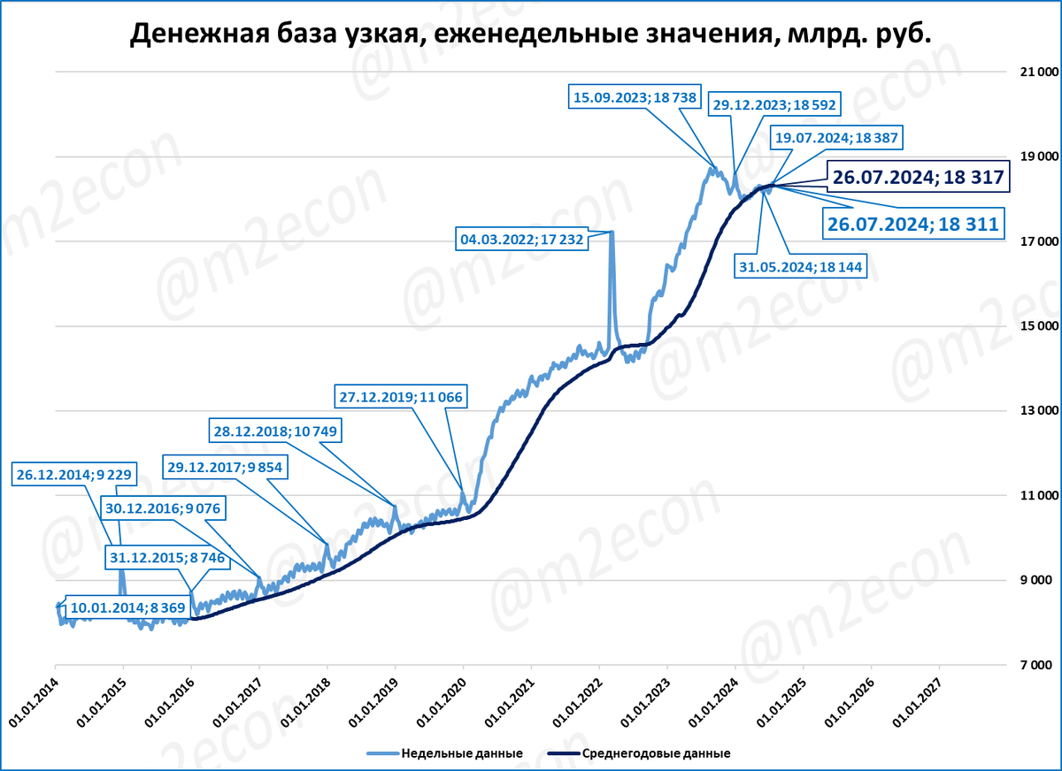 На 26 июля узкая денежная база составила 18,3 трлн рублей.