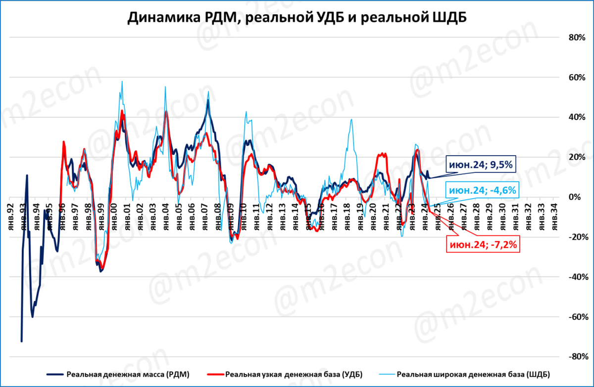 В 2024 году есть существенное отличие от прошлых случаев. Реальная УДБ падает, а реальная денежная масса (РДМ) при этом растёт. Причём рост РДМ (9,5%) хорош, особенно если сравнивать его с периодом 2012-2022 годов.
