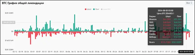 Третья причина — массовые ликвидации позиций, в особенности лонговых. В особенности это оказалось характерно для торговой сессии 5 августа, когда было закрыто длинных позиций сразу на $281,028 млн.