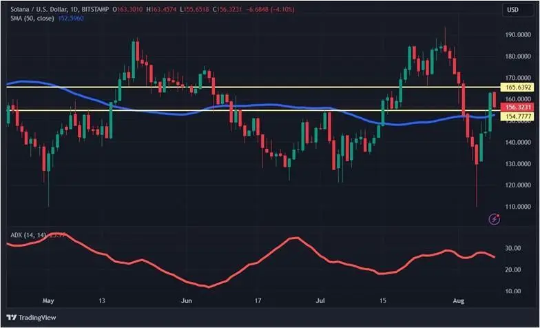 По техническому анализу Solana выглядит нейтрально с небольшим уклоном в сторону быков. Об этом говорит преодоление ценой 50-дневной скользящей средней (обозначена синим). А вот значение индикатора ADX – 25,77 говорит о слабости тренда. Уровни поддержки и сопротивления: $154,78 и $165,64 соответственно.