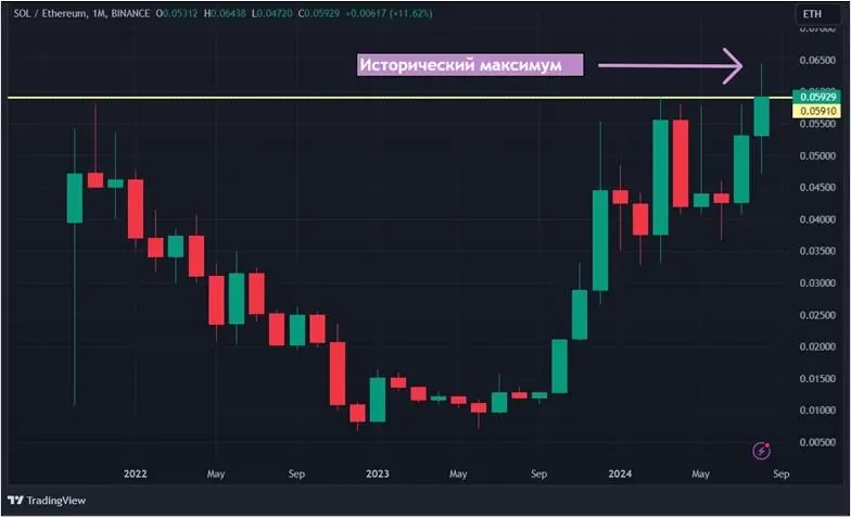 Также в среду, 7 августа, Solana достигла исторического максимума против эфира. Рекордная цена составила 0,064 SOL за ETH. Этого удалось достичь за счет роста Solana в тот же день на 0,13 % и падения эфира на 4,9 %, по данным биржи Binance.