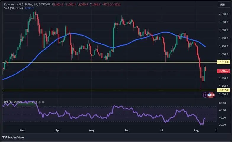 С точки зрения технического анализа, у эфира сформировался медвежий тренд. Цена основательно упала ниже 50-дневной скользящей средней, а индикатор RSI ниже 50. Пока не будет преодолен уровень сопротивления $2 811, говорить о смене тренда на бычий не приходится. Уровнем поддержки выступает отметка $2 112.