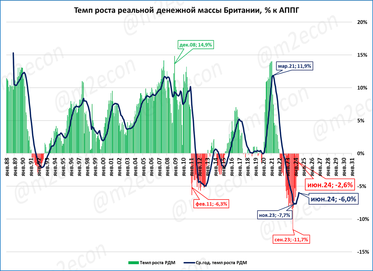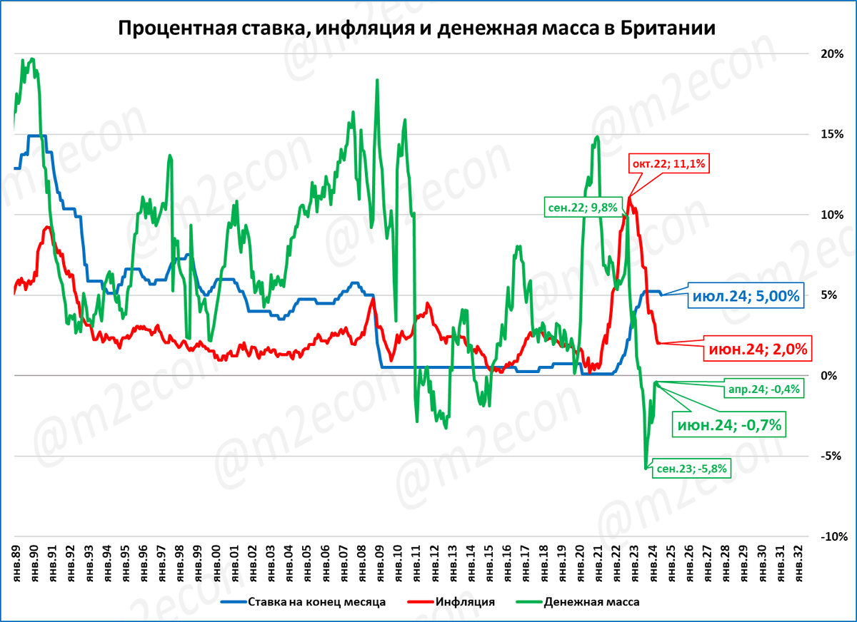 В Британии падение денежной массы замедляется, но до роста ещё далеко. Инфляция по итогам июня составила 2,0%.