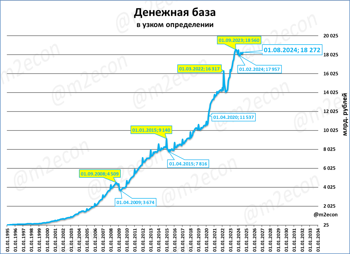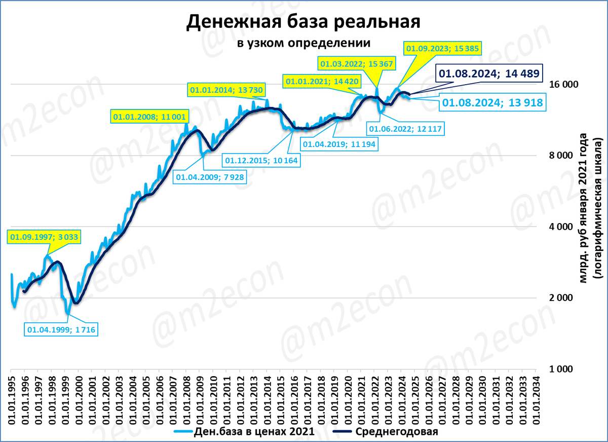Номинальная узкая денежная база (УДБ) уже 11 месяцев не может подняться выше пиков, показанных 1 сентября 2023 года.