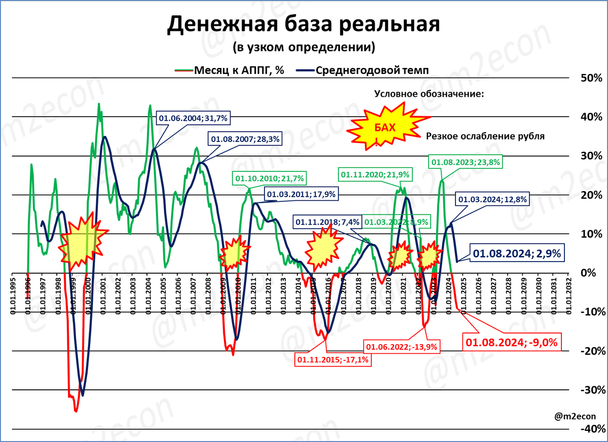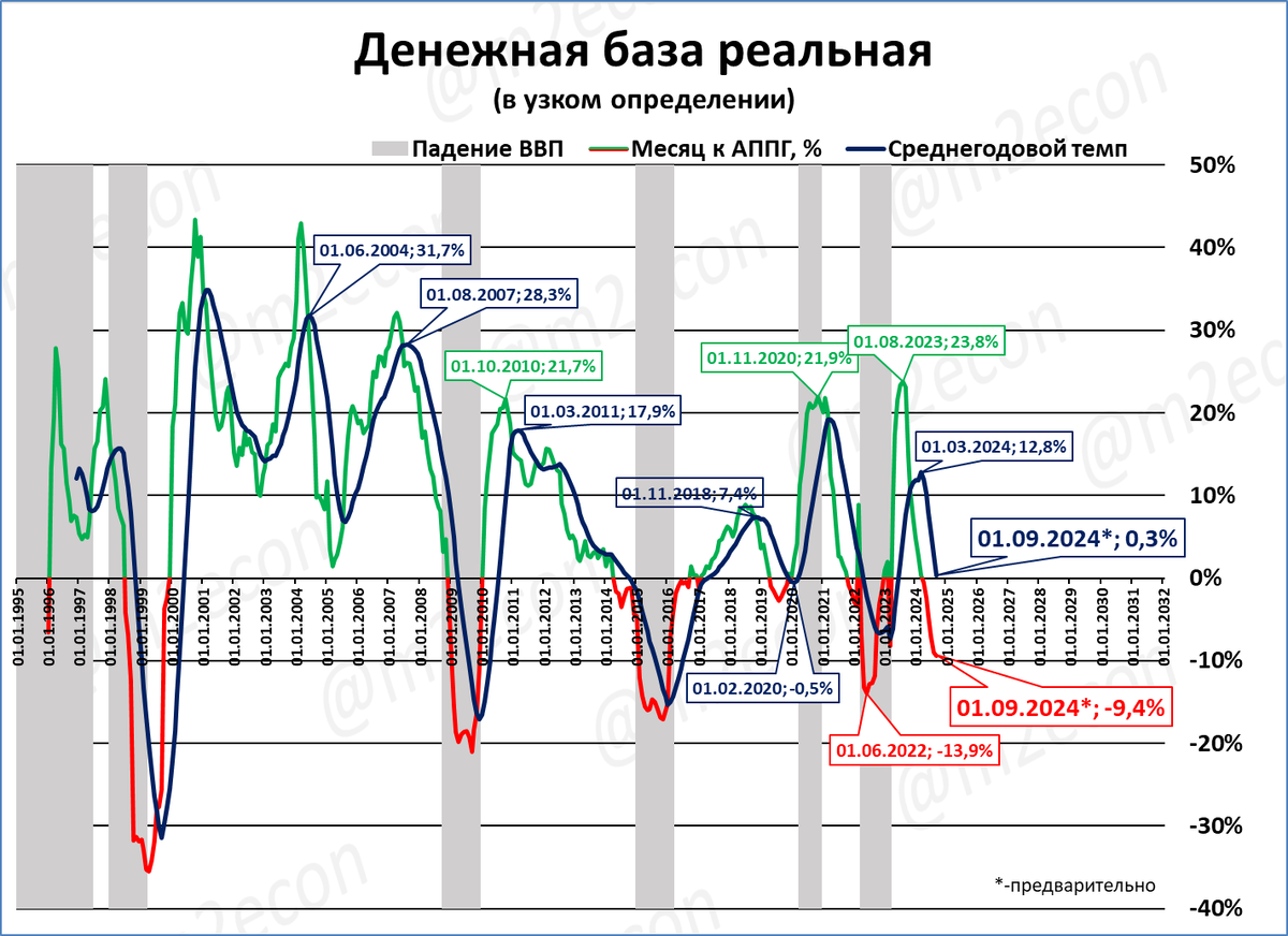 Реальная денежная масса сжимается на протяжении 29 месяцев (с февраля 2022 года). Однако это сжатие тоже замедлилось.