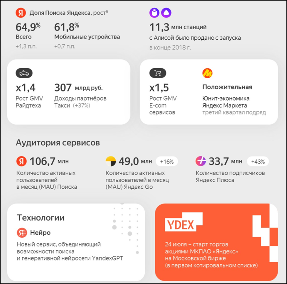 «Райдтех» включает сервис онлайн-заказа такси, каршеринг, а также сервис аренды самокатов. Аудитория «Яндекс GO» 49 млн человек (+16% г/г). Валовая стоимость заказов (GMV) в сервисах Райдтеха выросла на 41% г/г.