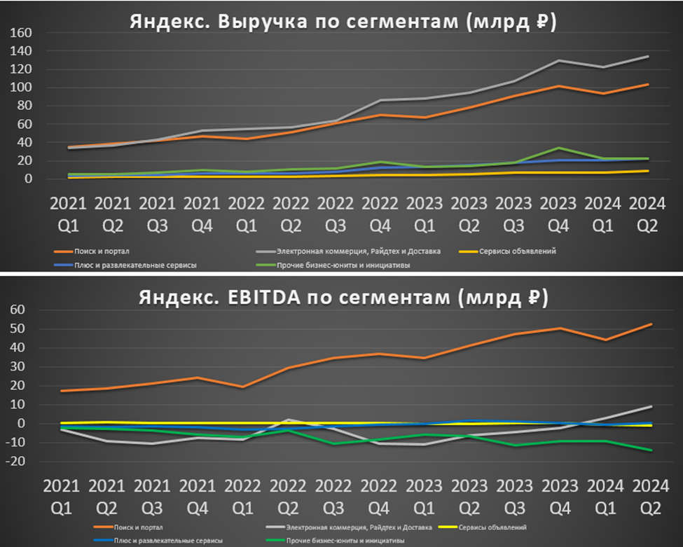Основную EBITDA генерирует «Поиск и портал». Но важно отметить, что третий квартал подряд положительное значение у «E-com и Райдтех». Основной убыточный сегмент: «Прочие бизнес-юниты и инициативы». Остальные сервисы болтаются в районе нуля. Т.е. по сути за счет «Поиска и портала» финансируется развитие других направлений.