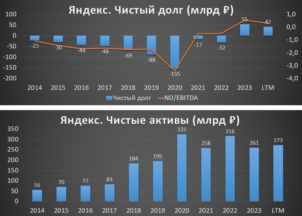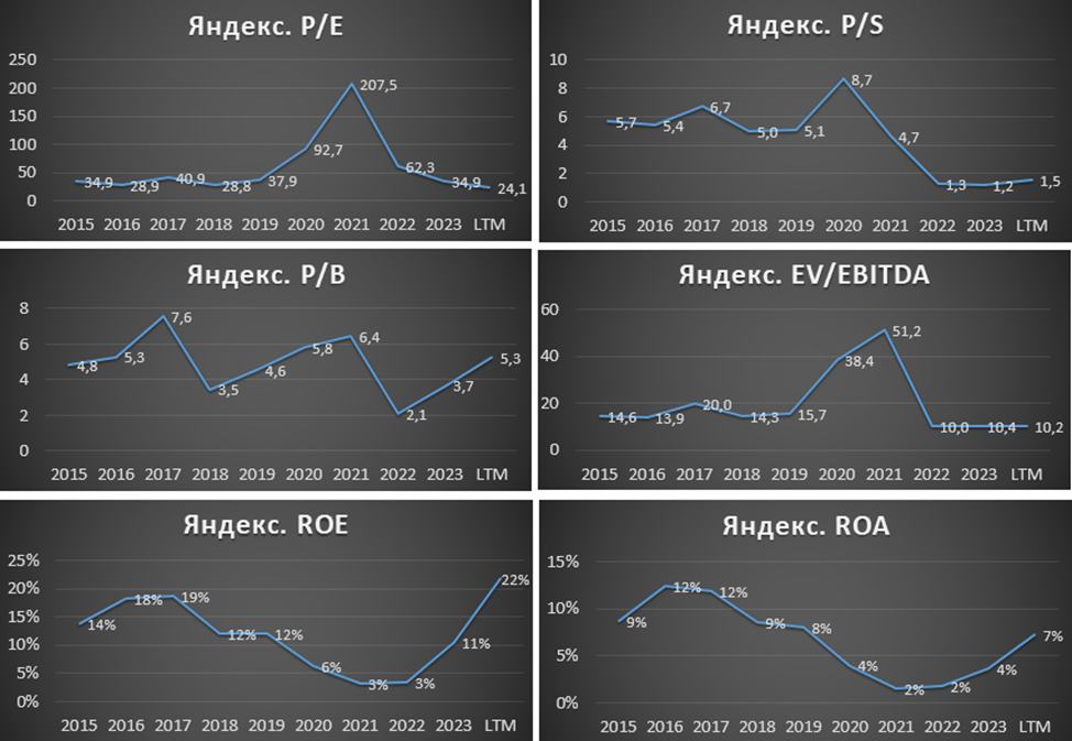 На квартальной диаграмме видно, что Q2 2024 получился лучше, как г/г, так и кв/кв. Вообще, Яндекс – это быстрорастущая компания. Средние темпы роста выручки около 40% в год, а EBITDA 20% в год. Также скорректированная ЧП постоянно положительная, что не так уж часто для подобных растущих компаний.
