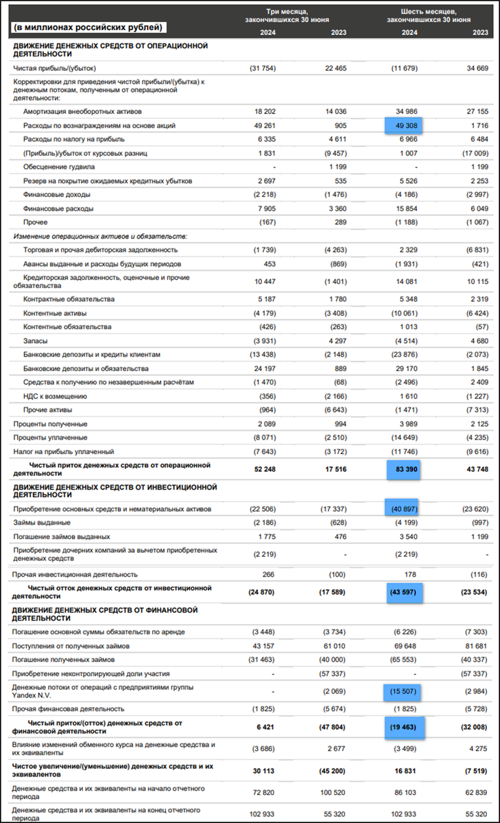 операционная деятельность 83,4 млрд (+91% г/г). Несмотря на формальный убыток, денег в компанию за полгода поступило почти в 2 раза больше, чем год назад. Здесь же видим корректировку на неденежную статью «Расходы по вознаграждениям на основе акций».