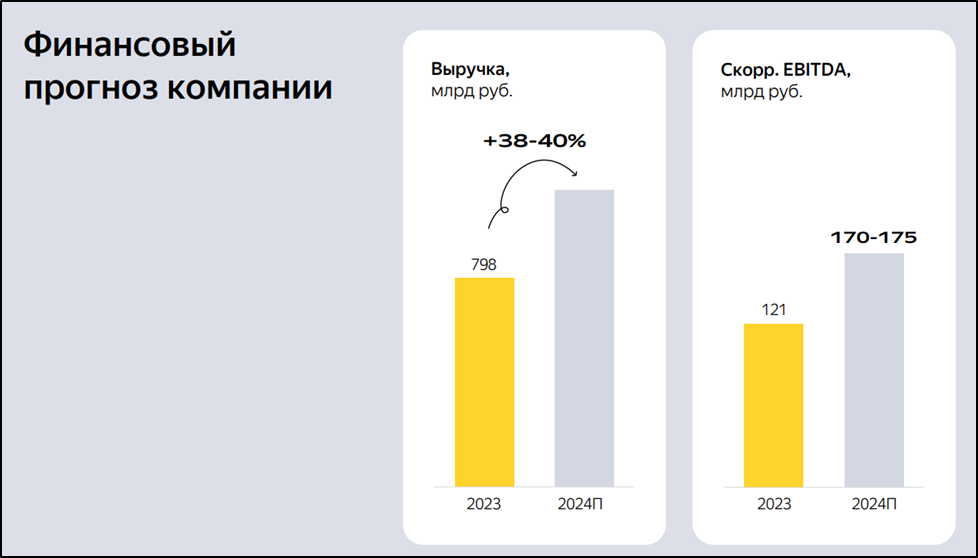 Впервые за долгое время, Яндекс дал прогноз результатов. Рост выручки по итогам 2024 года прогнозируется на уровне 40% г/г. А EBITDA на 75-80%.