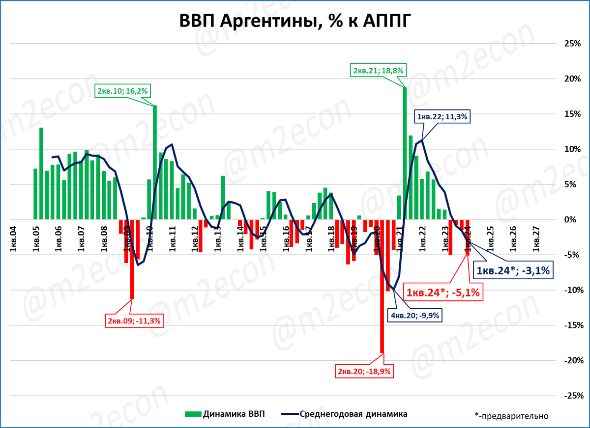 Падение ВВП в Аргентине в 1 квартале 2024 года составило -5,1%.