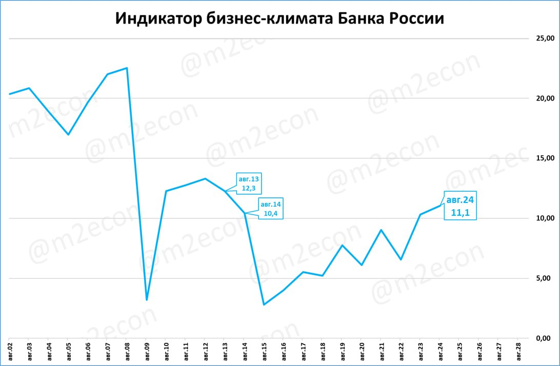 В августе индикатор бизнес-климата Банка России составил 11,1 пункта: лучший август с 2013 года (за 11 лет).