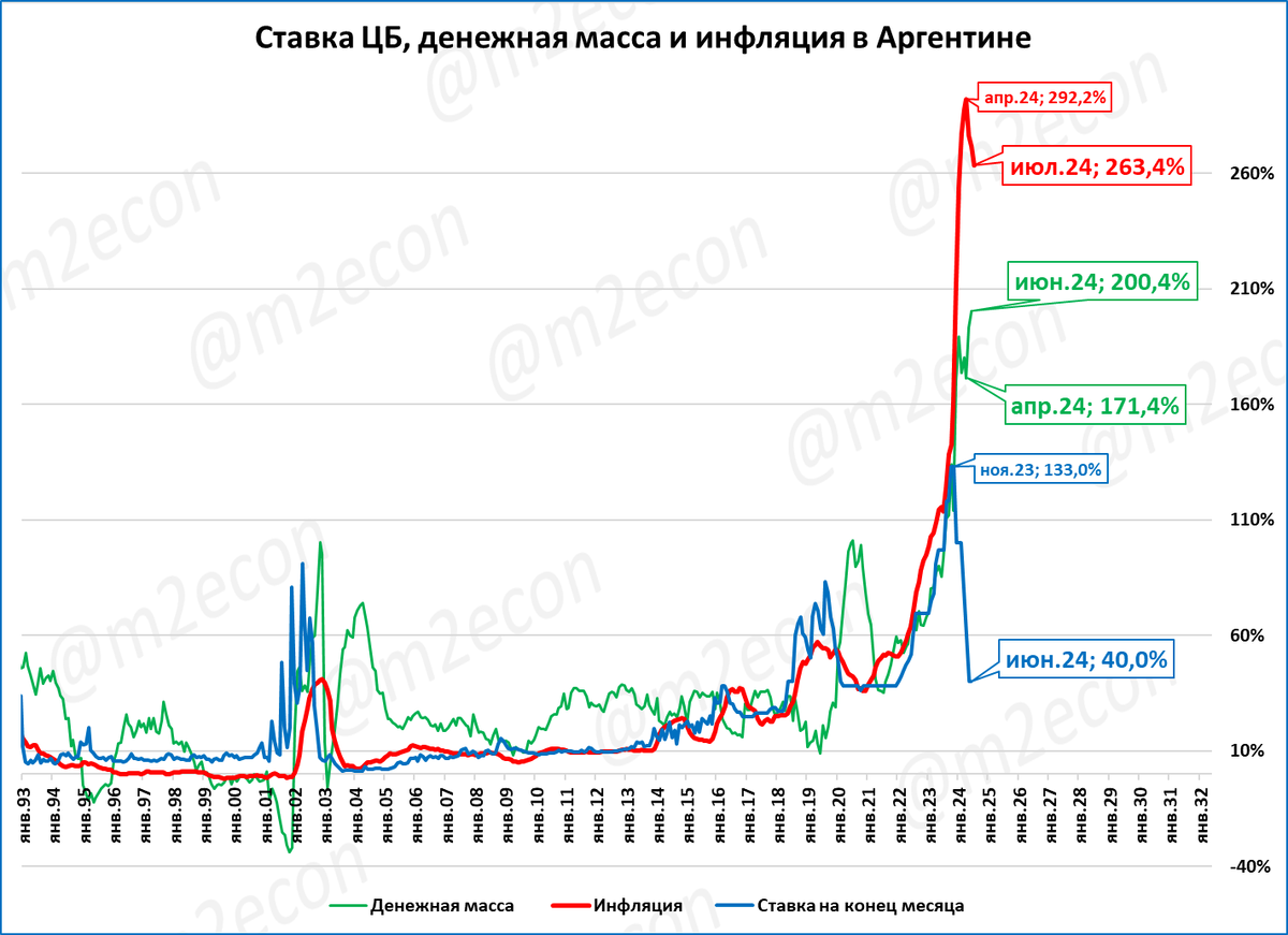 В Аргентине инфляция по итогам июля составила 263,4%. Реальная денежная масса сжимается. ВВП Аргентины в 1 квартале 2024 года упал на 5,1%.
