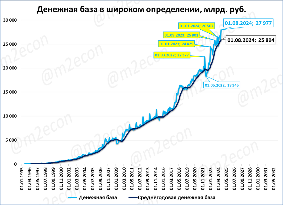 На 1 августа по предварительной оценке ЦБ денежная масса составила 104,8 трлн рублей, а денежная база 28 трлн рублей.