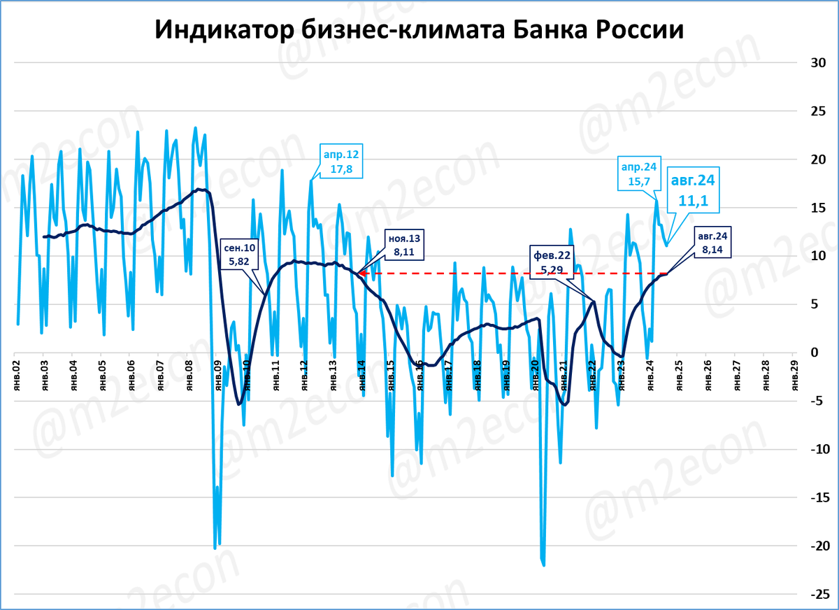 Мы используем исходные (несглаженные) данные, которые публикует ЦБ. В августе индикатор бизнес-климата составил 11,1 пункта.