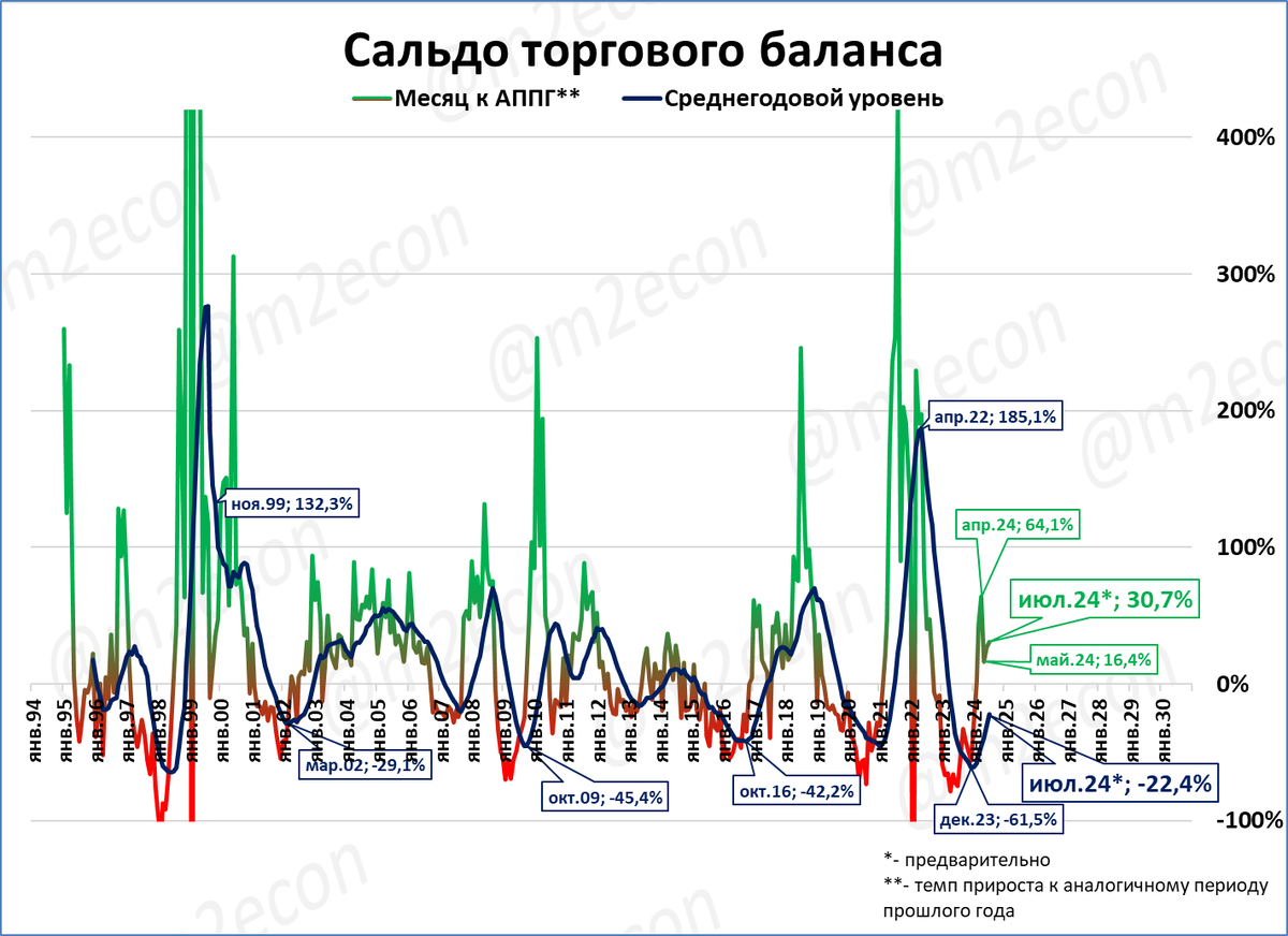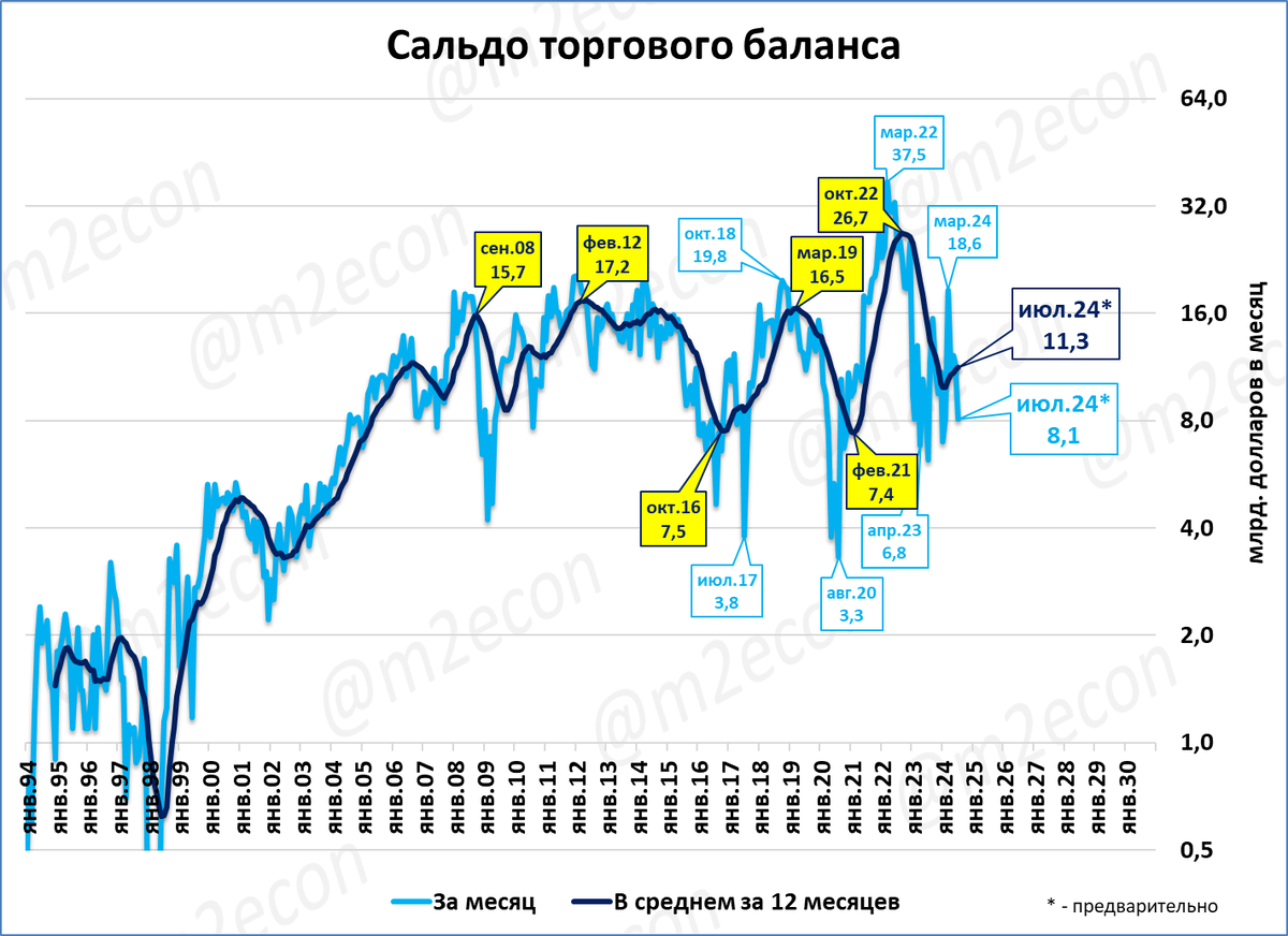 Падение торгового сальдо закончилось в январе. С февраля начался рост, и июле этот рост продолжается.