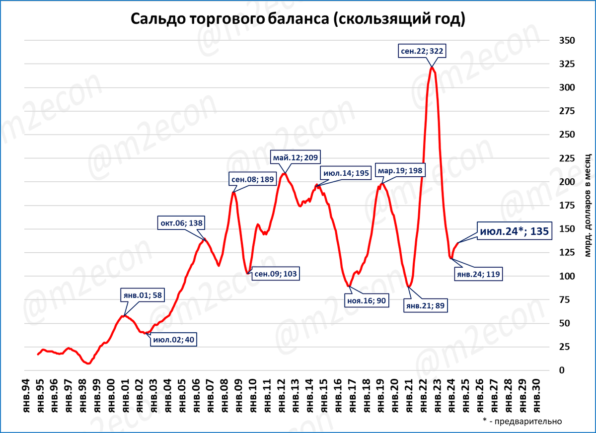 Сальдо за 12 месяцев (скользящий год) составило 135 млрд. долларов.
