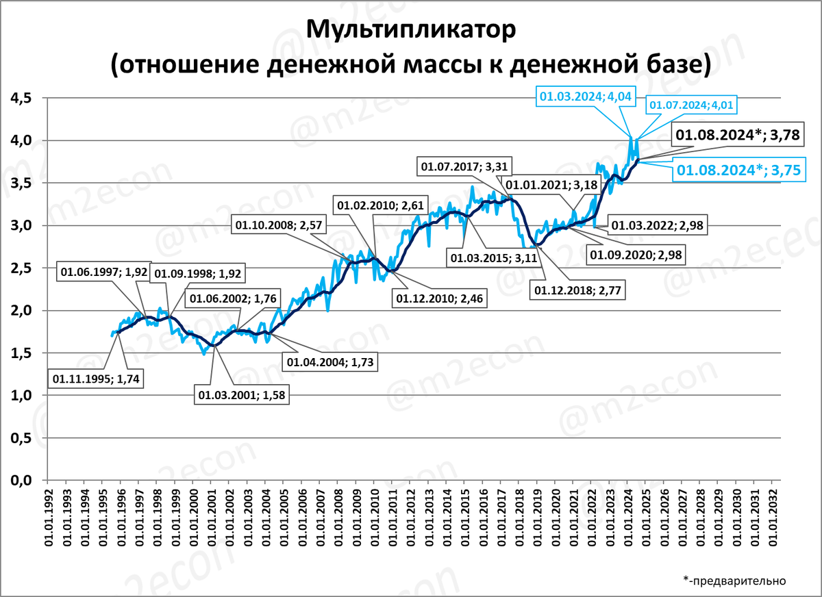 В марте 2024 года денежный мультипликатор установил исторический рекорд (4,04).