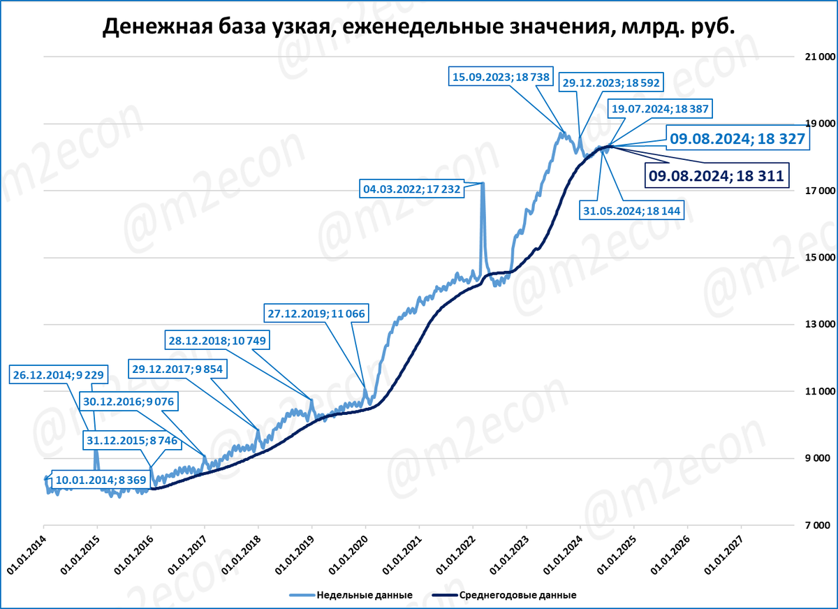 На 9 августа узкая денежная база составила 18,3 трлн рублей.