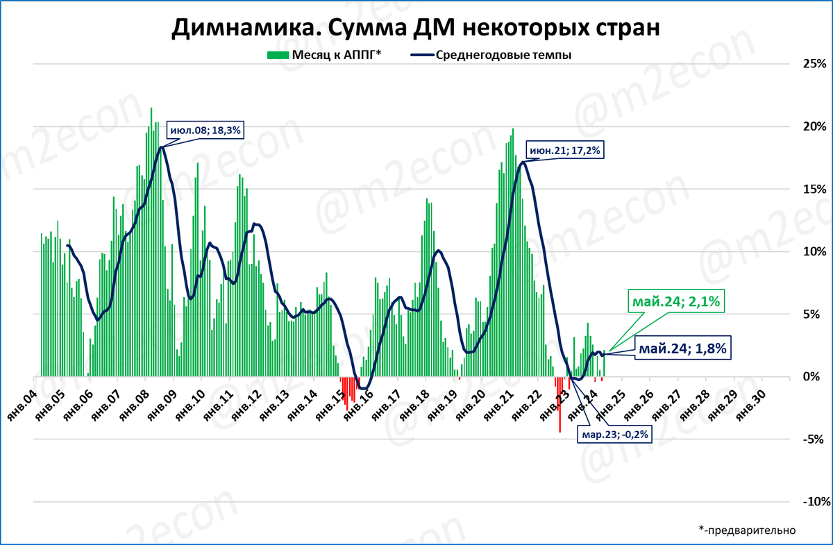По итогам мая денежная масса отобранных стран составляет 94,8 триллиона в долларовом эквиваленте.