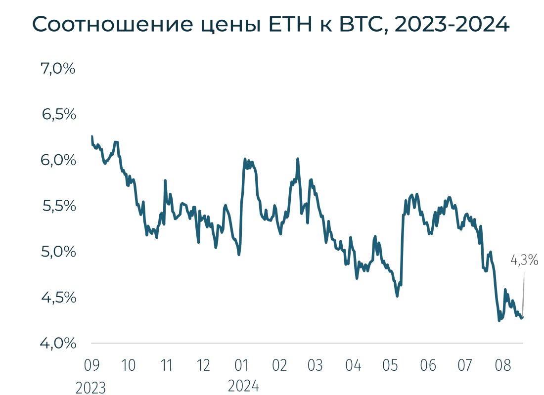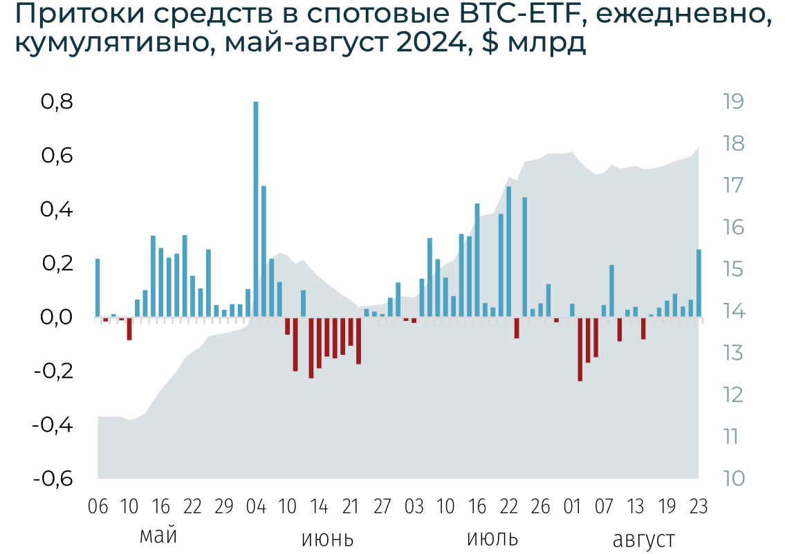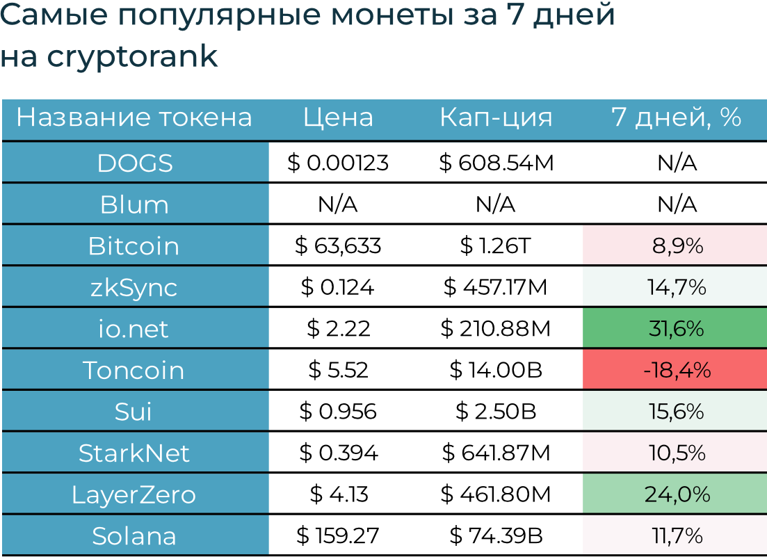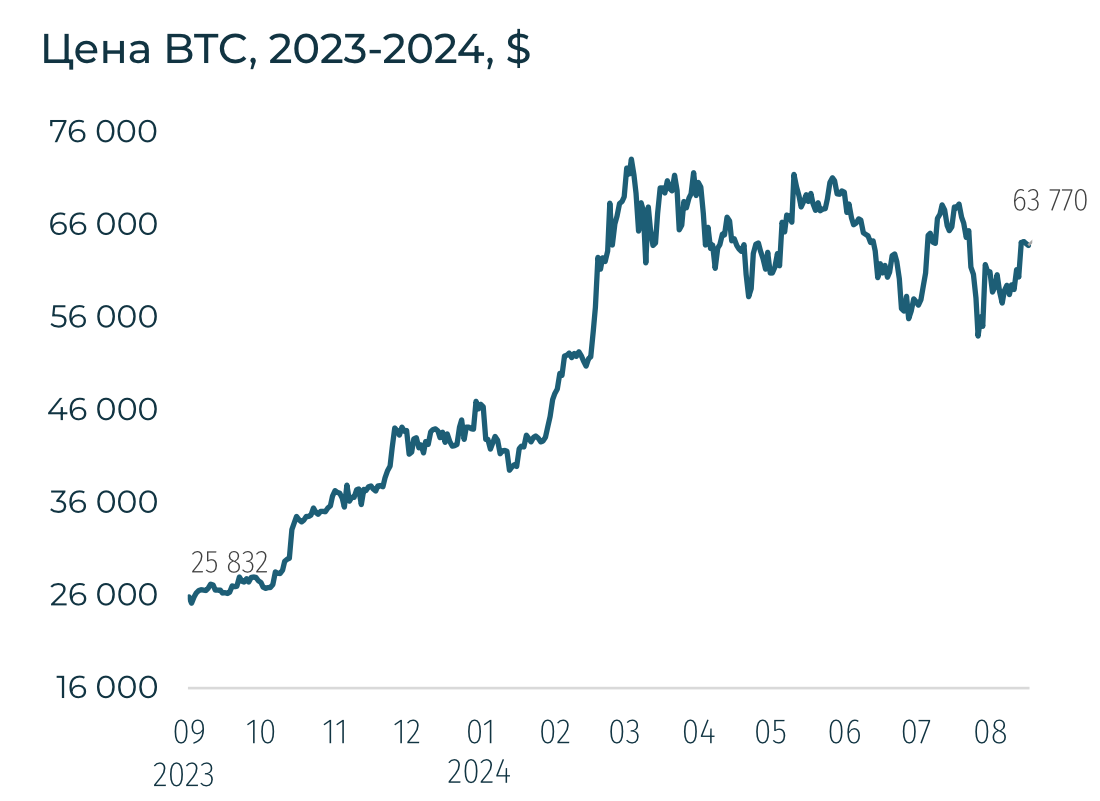 Ожидания инвесторов об снижении ставки ФРС и ЕЦБ в сентябре подкрепили настроения. Недельные притоки в криптопродукты возобновились и выросли с $30 млн до $0,5 млрд. За неделю BTC вырос на 7,2% до $63,8 тыс., ETH — на 3,7%.