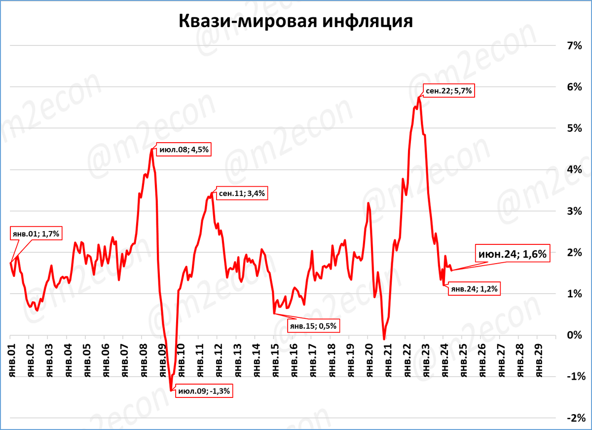 Нас, как обычно, интересуют не номинальные, а реальные величины. Чтобы посчитать реальную денежную массу, мы посчитали мировую инфляцию по собственной методике.