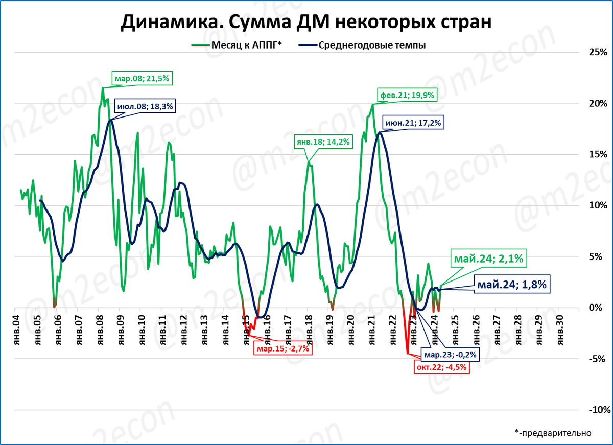 Как видно, заметные и продолжительные падения мировой денежной массы наблюдались только в 2015 и 2022 годах. Два месяца незначительного падения были и совсем недавно.