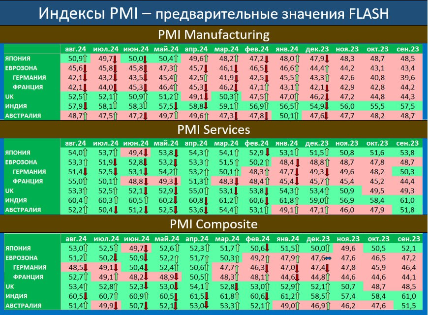 Предварительные индексы PMI: в промышленности Европы (Германия, Франция), Австралии и США деловая активность падает. Совокупный индекс показывает рост активности, благодаря сектору услуг, но в Германии не спасают даже услуги.