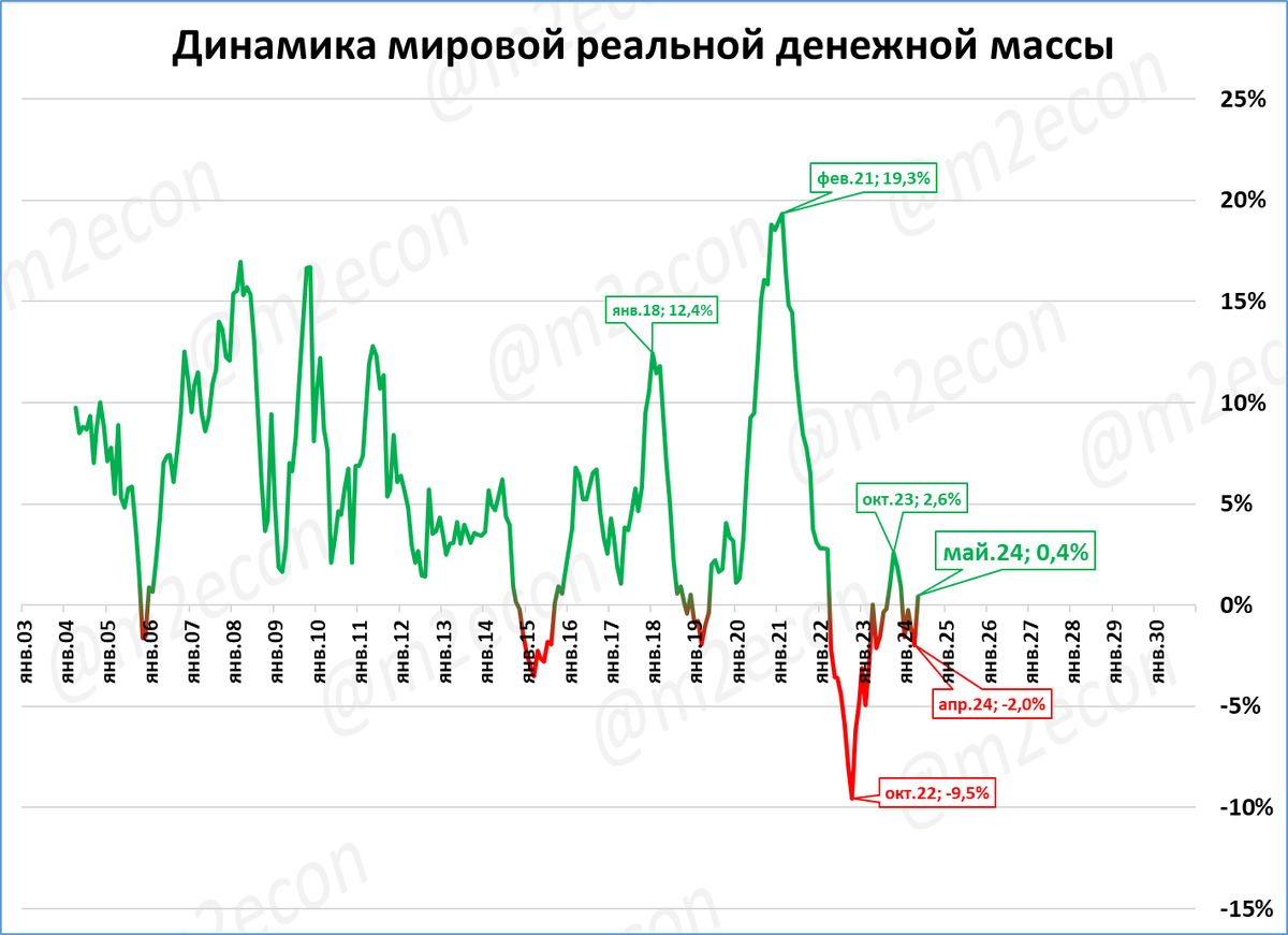 Если номинальных падений глобальной денежной массы было два (2015 и 2022), то в реальном выражении становятся заметными и падения 2005, 2019 и 2024 годов.
