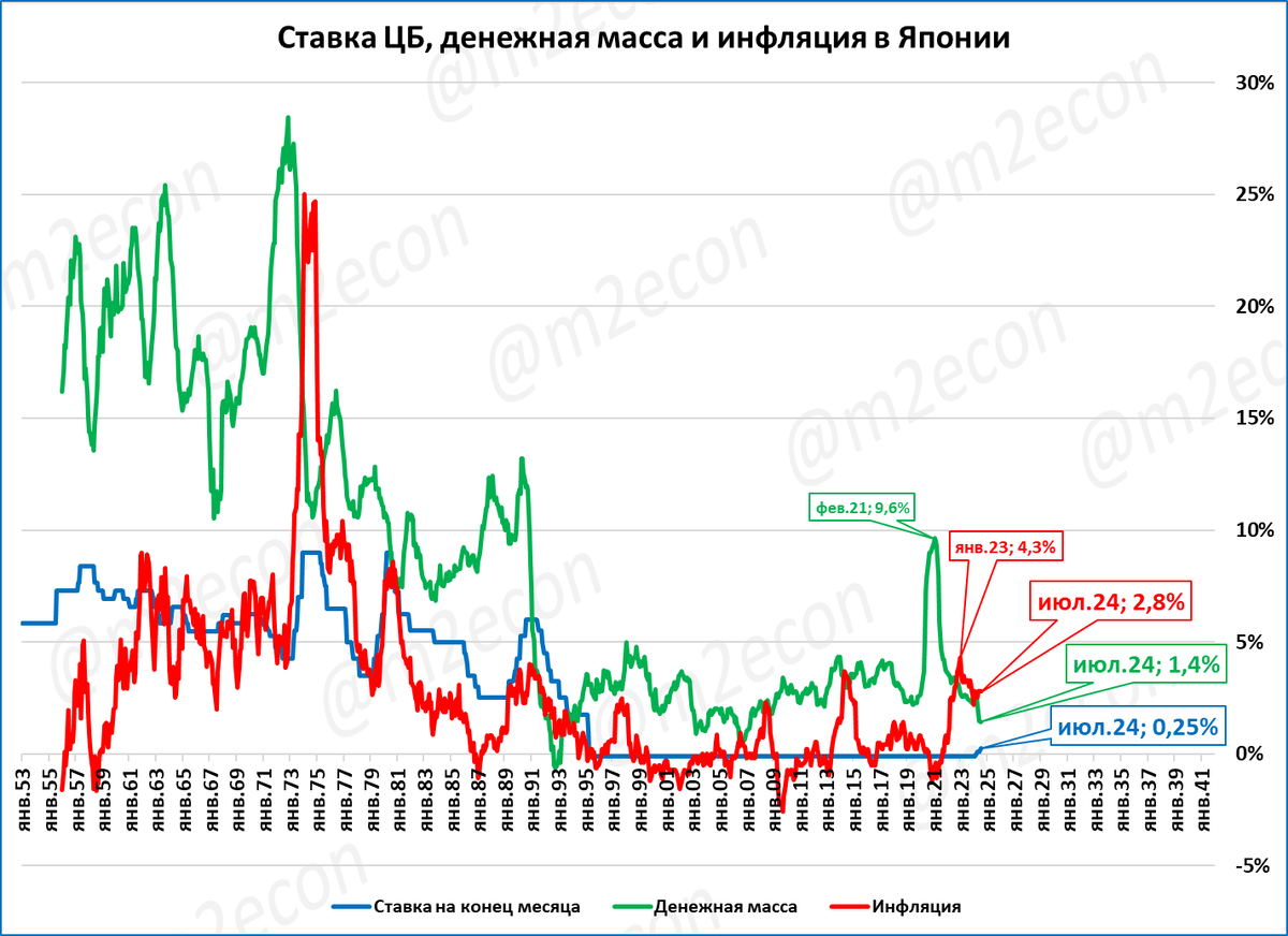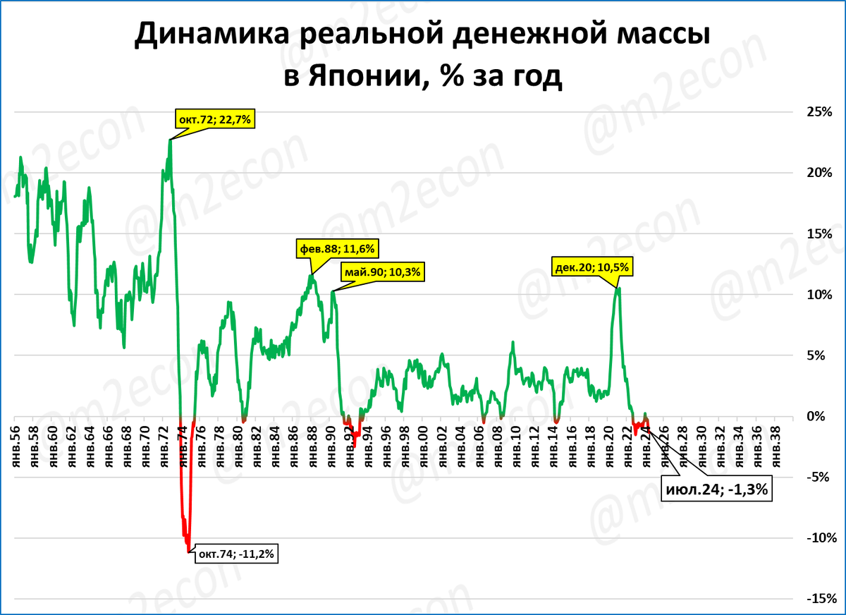 Япония: реальная денежная масса сжимается с 2022 года небольшими темпами. По предварительной оценке, ВВП во 2 квартале упал на 0,8%. Это уже второй квартал падения подряд.