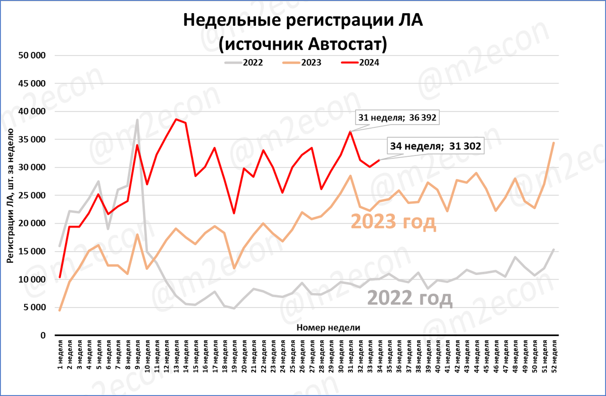 За 34-ю неделю года было зарегистрировано порядка 31 тыс. легковых автомобилей.