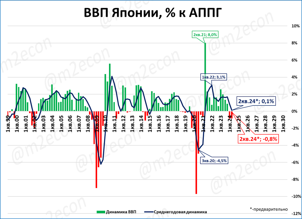 Падение ВВП в Японии во 2 квартале 2024 года, по предварительной оценке, составило 0,8%.