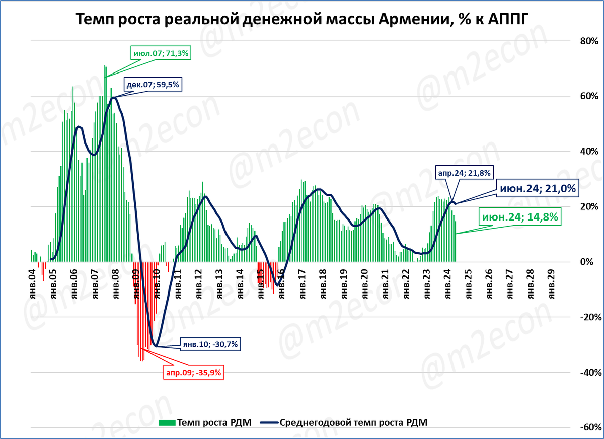 Ведомости написали, что среди стран ЕАЭС лучше всех растёт экономика Армении: +10,4% за первое полугодие. Посмотрим, что там происходит с денежной массой.