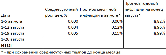 Если так будет до конца месяца, то по итогам августа инфляция составит 9,0% годовых.