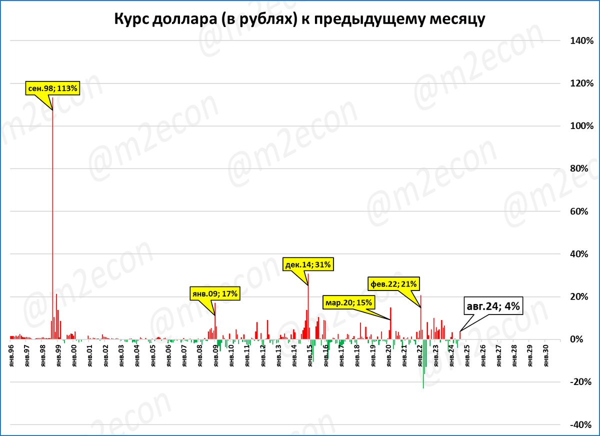 Резкие скачки курса (>15% к предыдущему месяцу) показаны жёлтыми выносками.