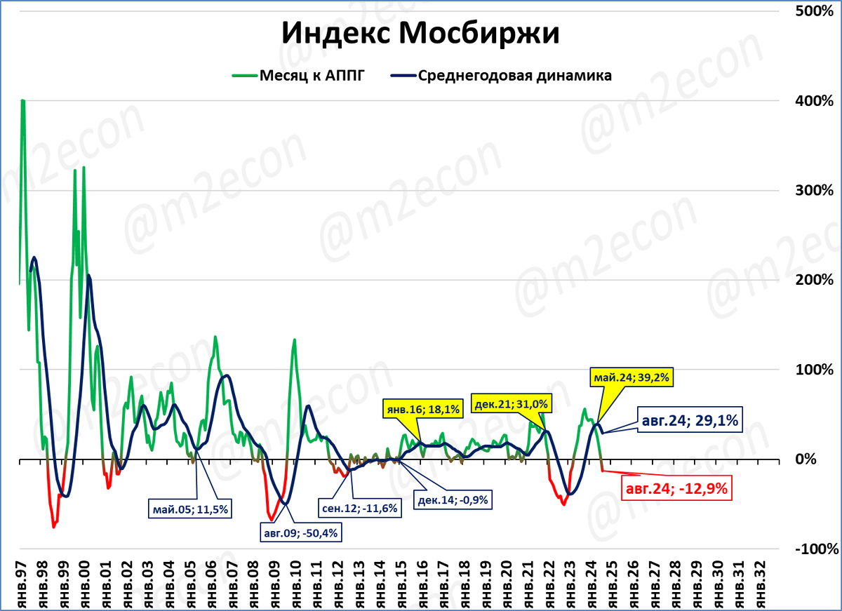 Индекс Мосбиржи начал падать в годовом выражении. Это первый месяц падения после 16 месяцев роста подряд.